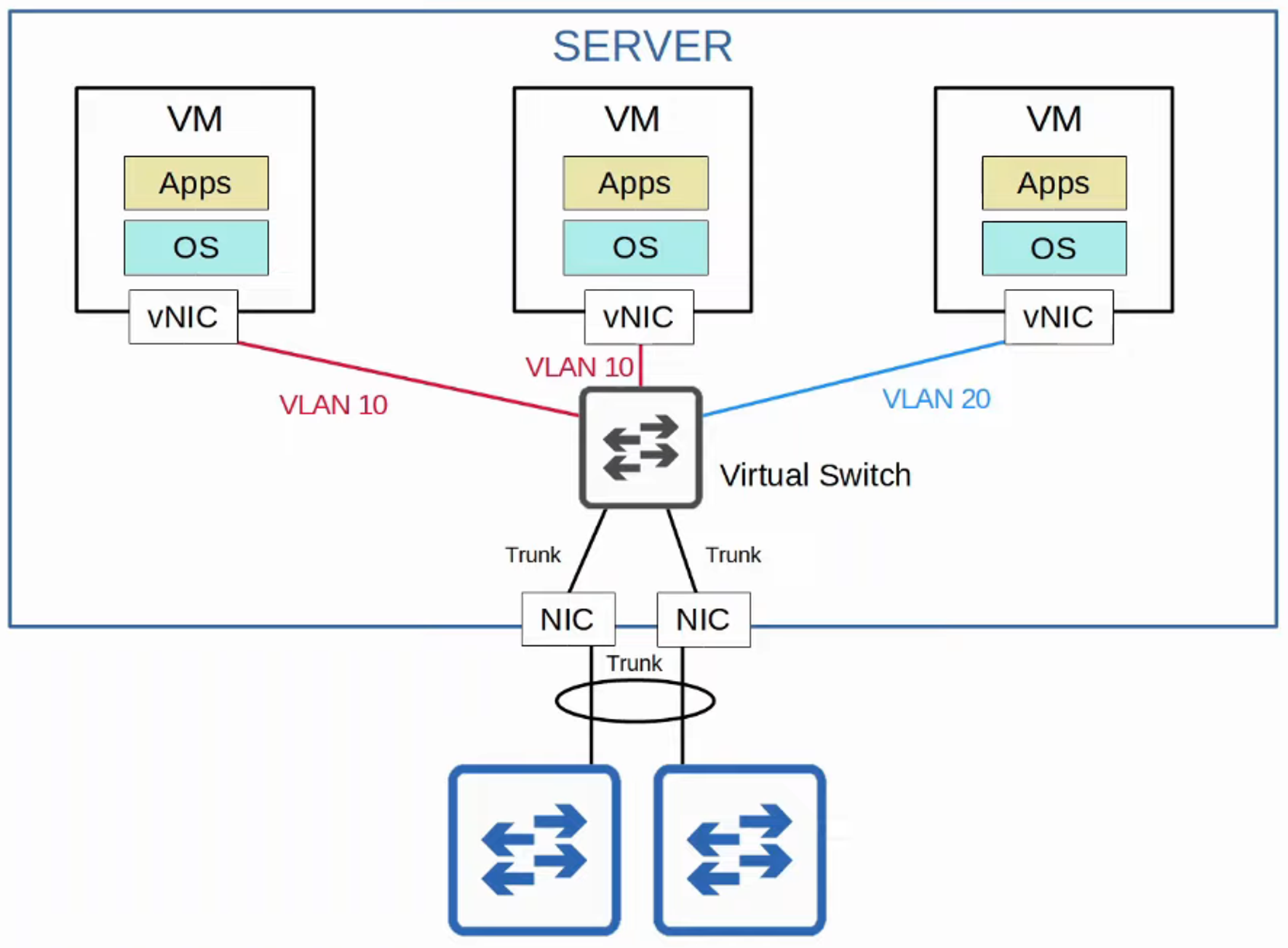 - VMs connect to each other and external networks via a Virtual Switch (vSwitch), which runs on the hypervisor.