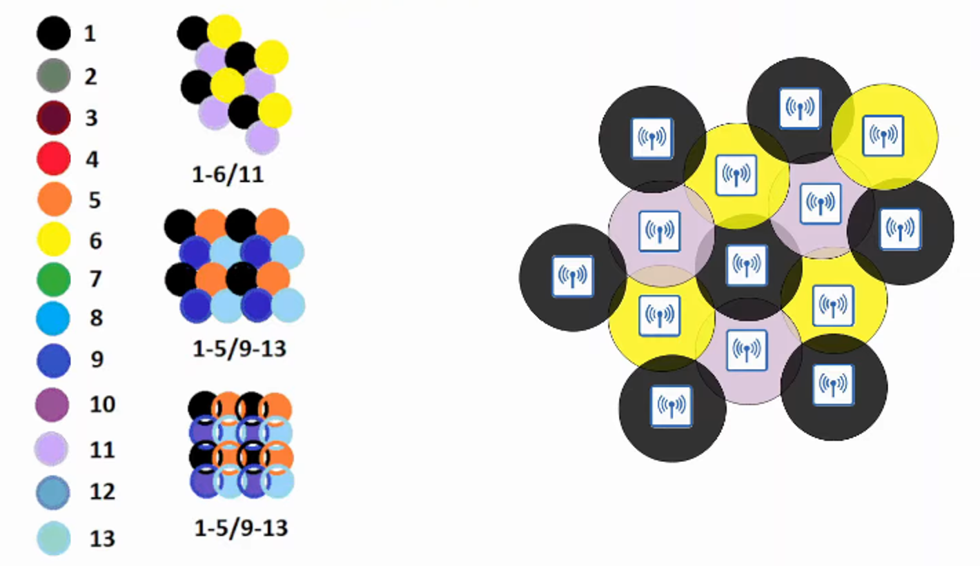 Using CHANNELS 1, 6, 11, you can place APs in a “HONEYCOMB” pattern to provide COMPLETE coverage of an area without INTERFERENCE between CHANNELS