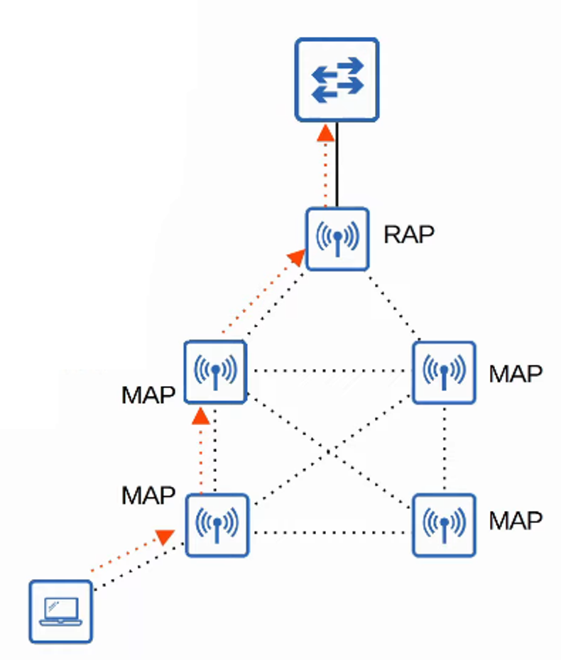 - At least ONE AP is connected to the WIRED NETWORK and it is called the RAP (ROOT ACCESS POINT)