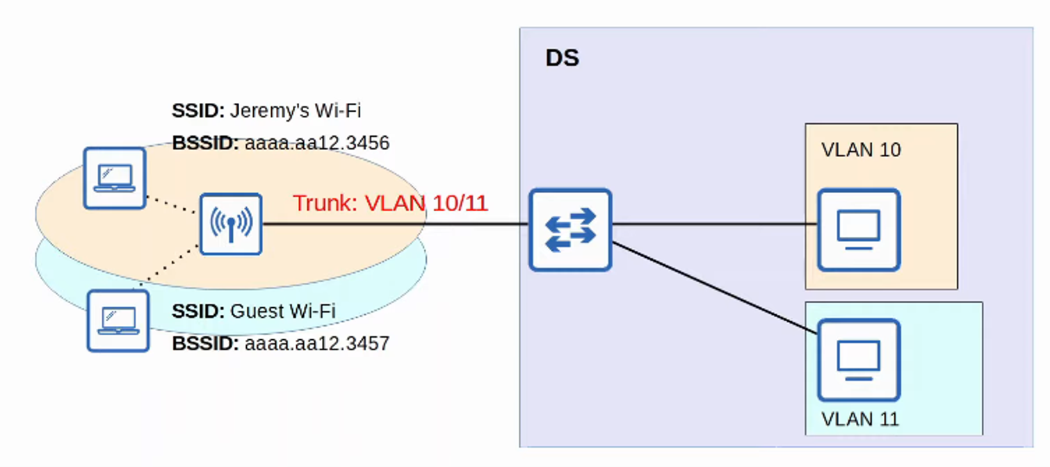 - Each WIRELESS BSS or ESS is mapped to a VLAN in the WIRED NETWORK