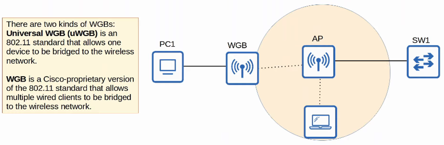 - A WORKGROUP BRIDGE (WGB) operates as a WIRELESS CLIENT of another AP and can be used to CONNECT WIRED DEVICES to the WIRELESS NETWORK