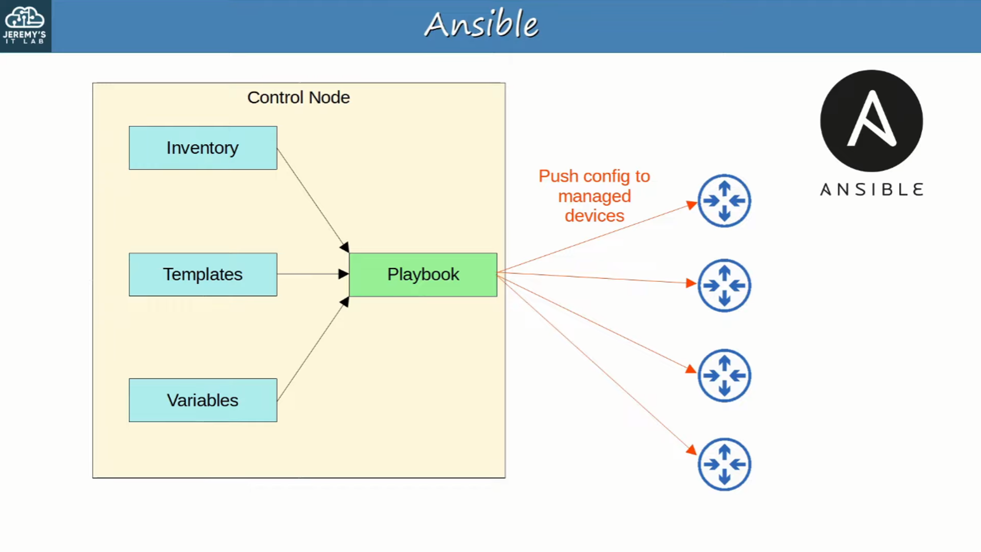 - Ansible uses a push model. The Ansible server (Control node) uses SSH to connect to managed devices and push configuration changes to them
