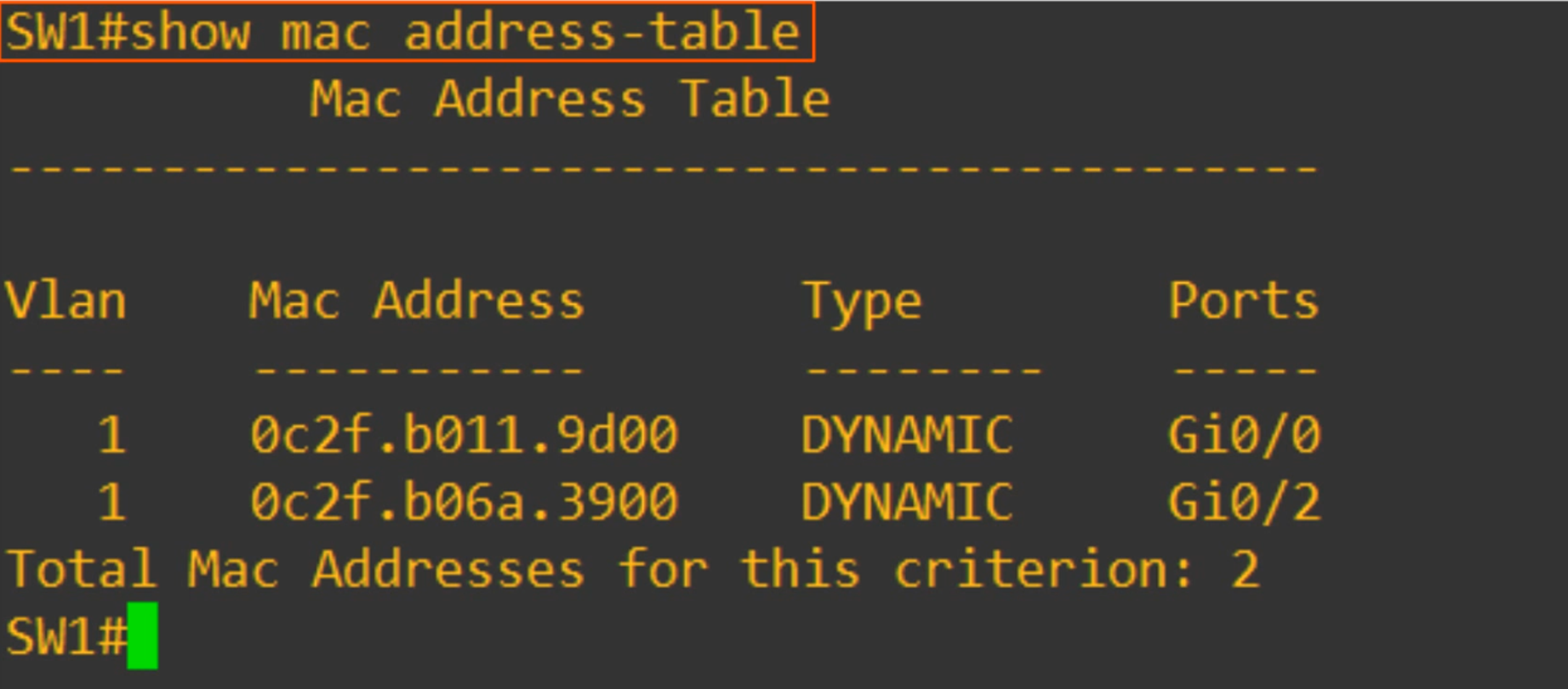 show mac address-table- Displays the MAC address table of the switch, showing: