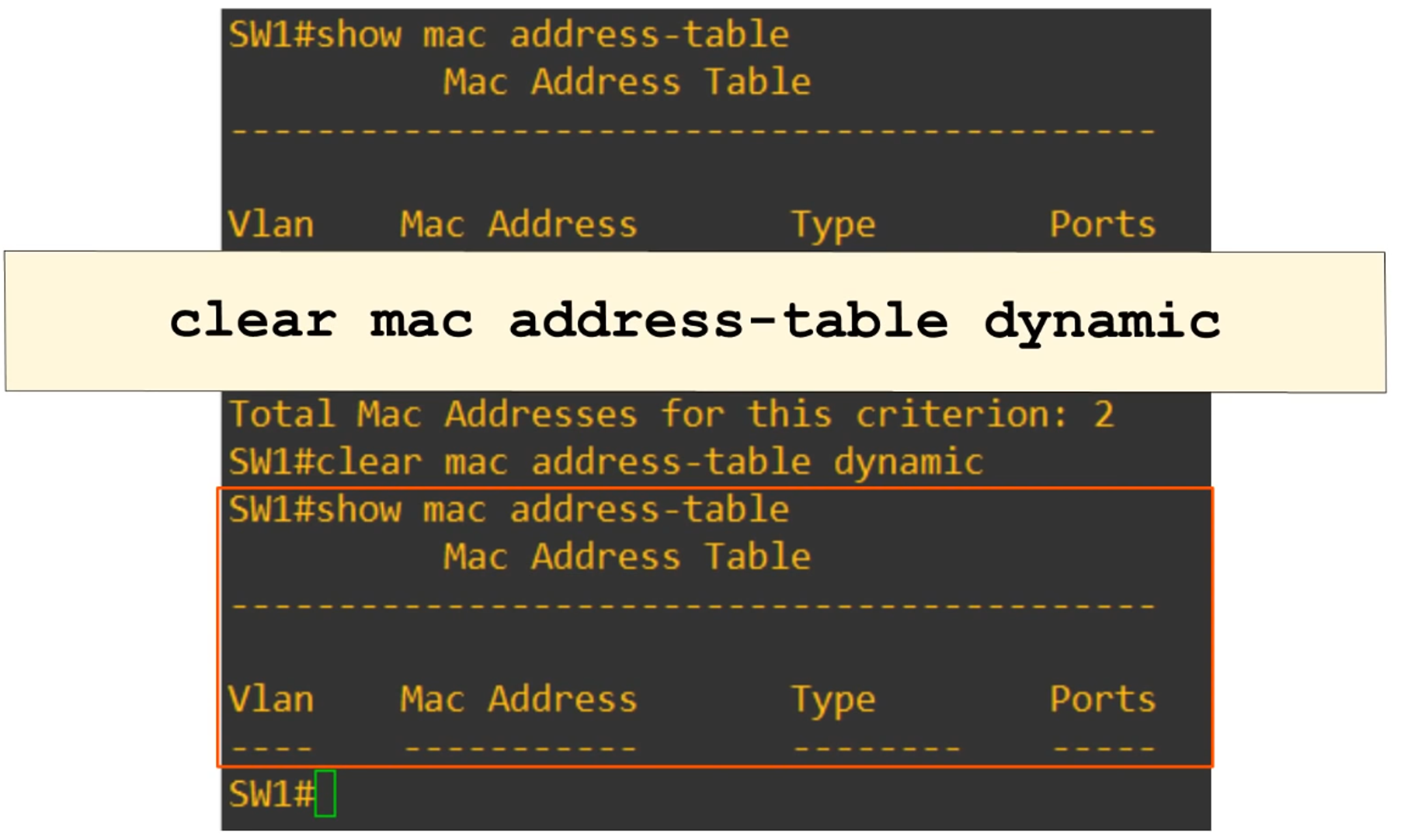 clear mac address-table dynamic <optional MAC address>- Clears the entire MAC address table on the switch.
