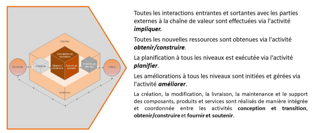 - Le principe “privilégier la valeur” guide les actions et décisions en mettant l’accent sur la création de valeur pour toutes les parties prenantes. Cela interagit avec d’autres principes, comme “optimiser et automatiser”, qui vise à améliorer l’efficacité des processus, contribuant ainsi à une valeur accrue.